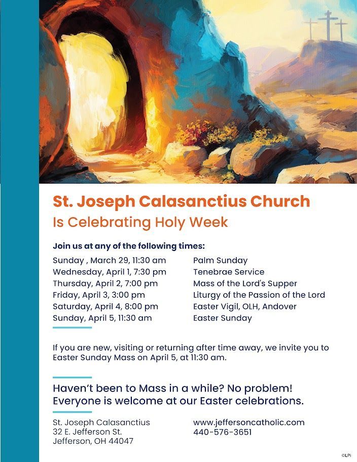 These two parishes, made up of three churches, serve the people of Jefferson, Andover and Kinsman, Ohio, along with the surrounding areas in Ashtabula County. Each parish is unique of course, but each is comprised of very dedicated men and women of faith in every generation. We welcome visitors! If you have questions or need additional information, click on the “Contact Us” tab and use the information there to send an email or call our Church Office. If you are new to the area and would like to become a member, you may pick up a registration form from the Church vestibule or click here to access a link to a PDF that you can download and print. Completed forms can be mailed to us, dropped off at the Church Office, put in the Sunday in the collection basket, or scanned and emailed to the parish email address, saintjoseph@jeffersoncatholic.com.